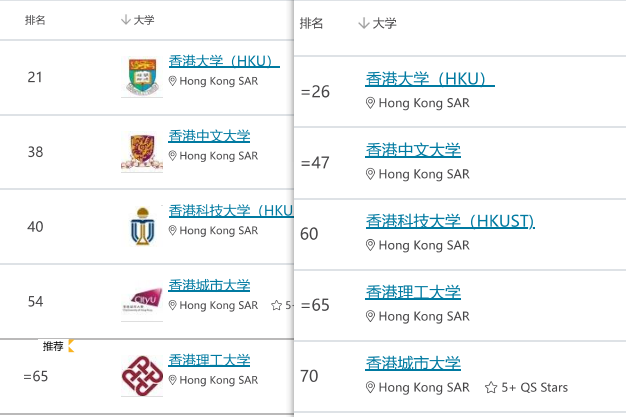 从数据显示可以看出,港前五院校,除香港理工大学排名维持不变外,其他4所学校排名均有所下滑。