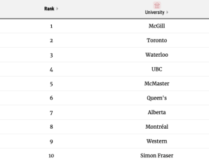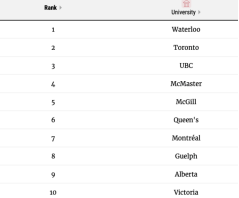 排名前十的大学为:麦吉尔大学、多伦多大学、滑铁卢大学、英属哥伦比亚大学、麦克马斯特大学、皇后大学、阿尔伯塔大学、蒙特利尔大学、西安大略大学和西门菲沙大学。