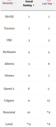 阿尔伯塔大学从去年的第6位上升至第5位。还有渥太华大学、达尔豪斯大学以及卡尔加里大学都有了一定的提升,尤其是卡尔加里大学,从去年的第12名直接升到第9位