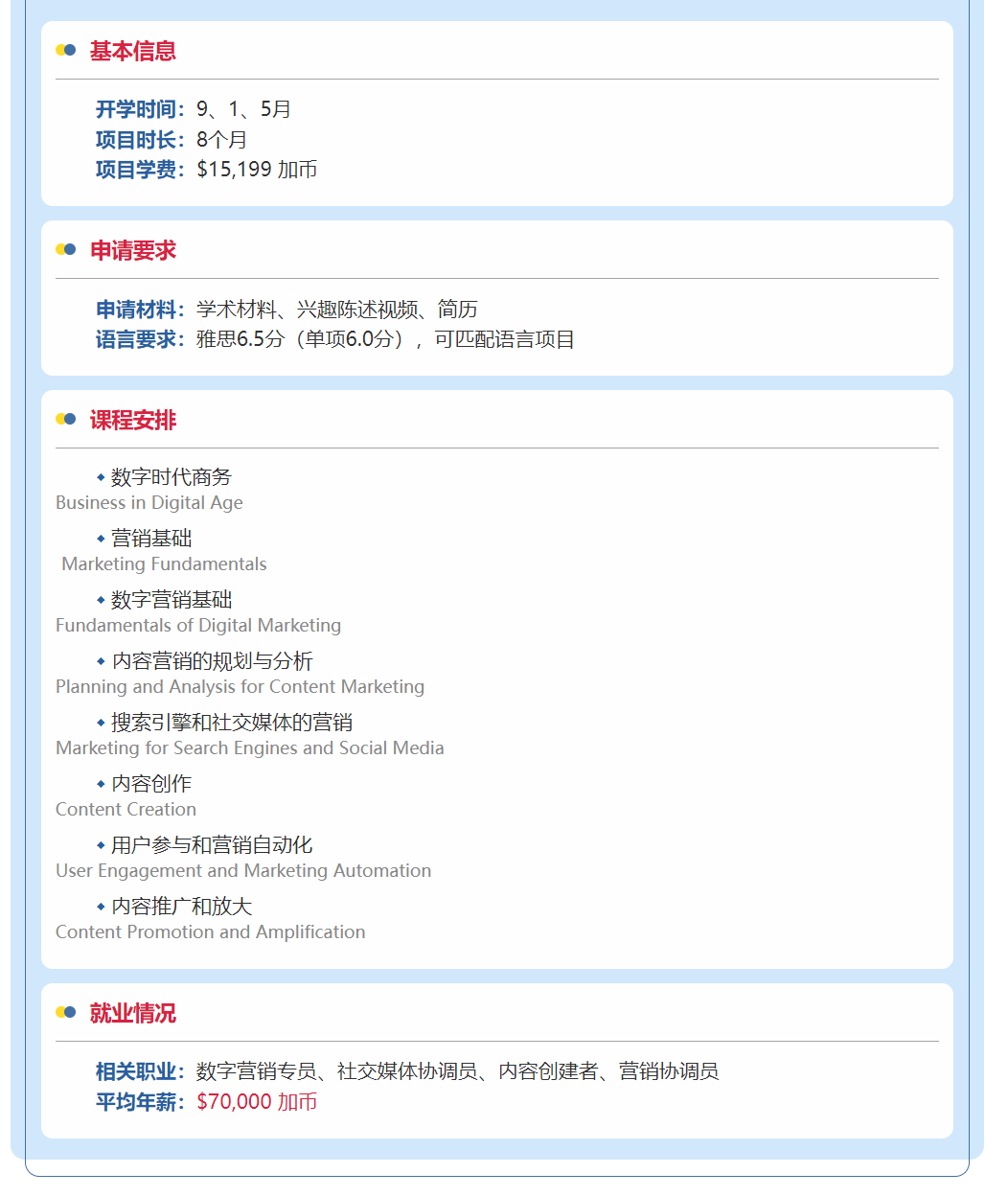 约克大学拥有加拿大所有大学中 规模最大 、在读的全日制 学生人数最多 的研文课程项目! 为满足广大留学生的需求,约克目前已特别为国际生开设了10个不同方向的研究生文凭项目!每一个都是由行业专家根据市场需求,精心挑选并踔厉打造而成。包括: 数字与内容营销 、 会计 + 高级专业会计 、 公共关系 、人力资源 、 商业管理 、 后端与区块链开发 、 网络安全运营 + 主动型网络安全 、 云运维 等。