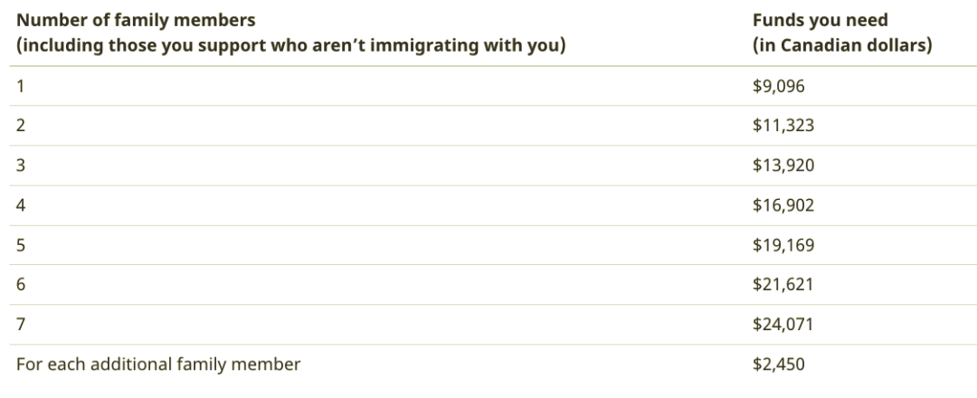 申请人需提交定居资金证明自己有足够的的经济能力在所申请的试点社区内定居,定居资金的数额取决于家庭人数,即便家人不随行移民,也要计算在家庭人数内,下图为 2022 年最新的定居资金要求金额 ( 货币单位为加元 ) 。