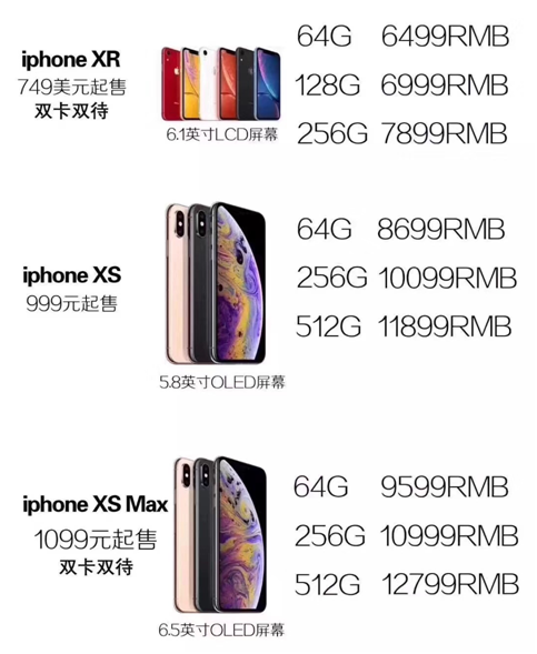 iPhone XS Max 支持双卡,售价 1099 美元起。 iPhone XS 售价 999 美元起,同 iPhone XS Max 都提供最高达 512GB 存储容量。 iPhone XR 售价 749 美元起,价格相对较低,同时拥有更多颜色,苹果公司称之可以让更多人拥有 iPhone 。