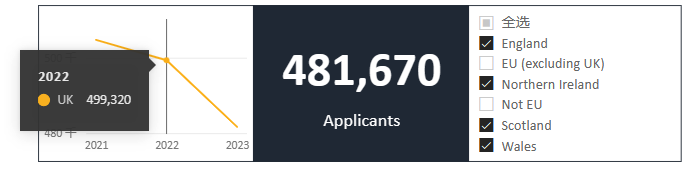 英国本土:根据2023年UCAS数据显示,英国本土 共有481670位申请者,占总申请人数的80.7%,申请人数较去年(499320)降低约17650人。