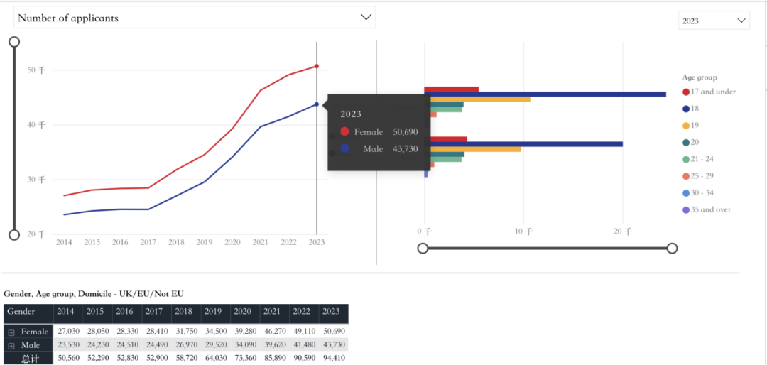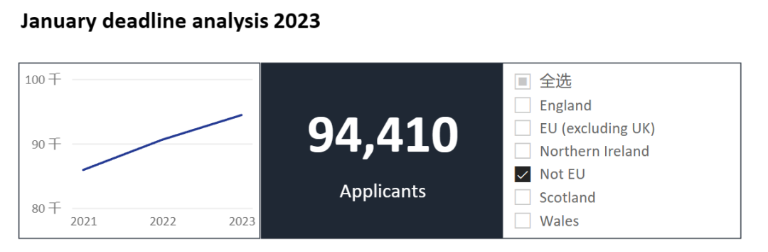 国际生:2023年通过UCAS递交的国际生(除英国本土和欧盟外)共有94410位申请者,相比22年(90590)上升近4000人!