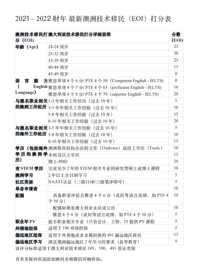 - 根据EOI的评分表 ,申请人已经达到65分。这个只是个门槛分数,实际分数会根据职业和每个州的政策而提高。分数越高,越容易获得邀请名额。