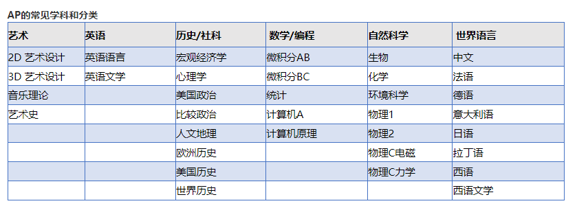 1956 年,首次举办 AP 考试,当时的考试课程只有 11 门。经过 60 多年的发展,目前有 7 个大类, 38 门课程,囊括了音乐、历史、计算机、数学等。目前以 Calculus AB( 微积分 AB) 、 Calculus BC( 微积分 BC) 、 Statistics (统计学)、 Physics B( 物理 B) 、 Macroeconomics (宏观经济学)、 Microeconomics (微观经济)几门课程为主。