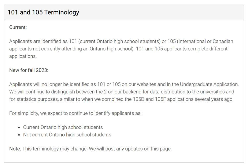 OUAC原有省内学生申请通道(UNDERGRAD 101)和省外学生申请通道(UNDERGRAD 105)两条申请通道。