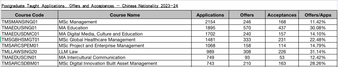 其次申请最多的就是教育硕士(MSc Education),23-24学年申请人数1895,offer发放数579,录取人数437,整体录取率23.06%,但是比管理学的录取率要高的多。