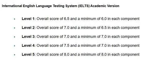 以往UCL无论本科学习还是研究生学习,雅思的要求只分三个等级。而今年UCL对雅思的成绩要求进行了调整,从原本的Standard(标准)、Good(良好)、Advanced(高级)三个等级调整成了1-5五个Level。