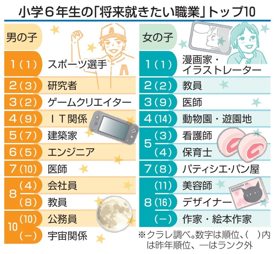 男孩的首位是运动员,占18.0%,获得压倒性青睐。由于日本队在世界棒球经典赛(WBC)上的优异表现,棒球时隔两年超越足球。“太空相关”跻身第十。负责人介绍称:“似乎是接触到民间企业涉足太空产业领域的新闻,产生了浪漫的憧憬。”