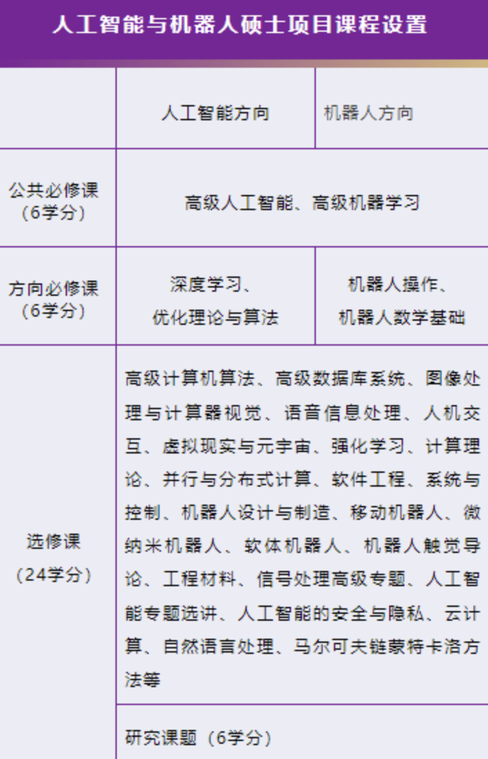 人工智能与机器人硕士学生需完成 4门必修课、8门选修课 ,至少36专业学分方能毕业。