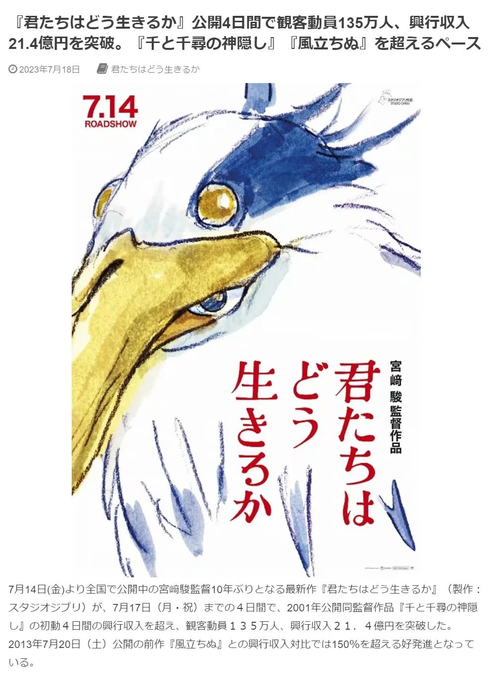 吉卜力工作室导演宫崎骏的最新作品《你想活出怎样的人生》(君たちはどう生きるか)从7月14日起已经在日本全国上映。