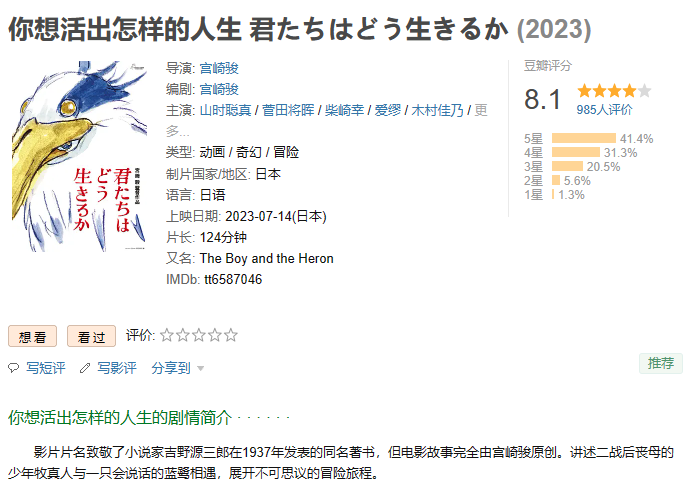 截止发送文章前,这部《你想活出怎样的人生》在国内豆瓣的评分是8.1(985人评价)。随着观看人数增多,评分后期还会有变化。