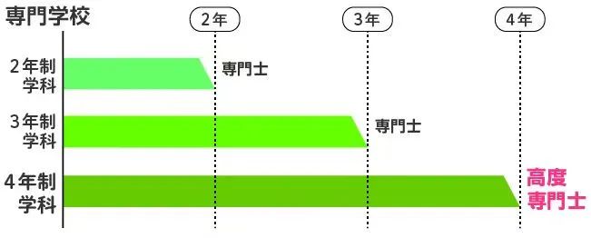 日本的专门学校主要 以职业教育为培养目标 ,在法律上和日本的短期大学处于同一个学历地位。专门学校 招收18周岁及以上的学生 ,学制在2-4年。2~3年毕业后为“ 専门士 ”,4年及以上毕业为“ 高度専门士 ”。
