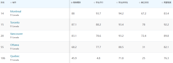 学生观点:在该城市学习过的学生会向他们的同龄人推荐它吗? 在这份榜单中,加拿大共有五个城市上榜,并且有3个城市跻身TOP20。