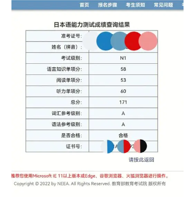 N1合格线100分,满分180,且词汇语法、阅读、听力各项必须大于等于19分才算及格。