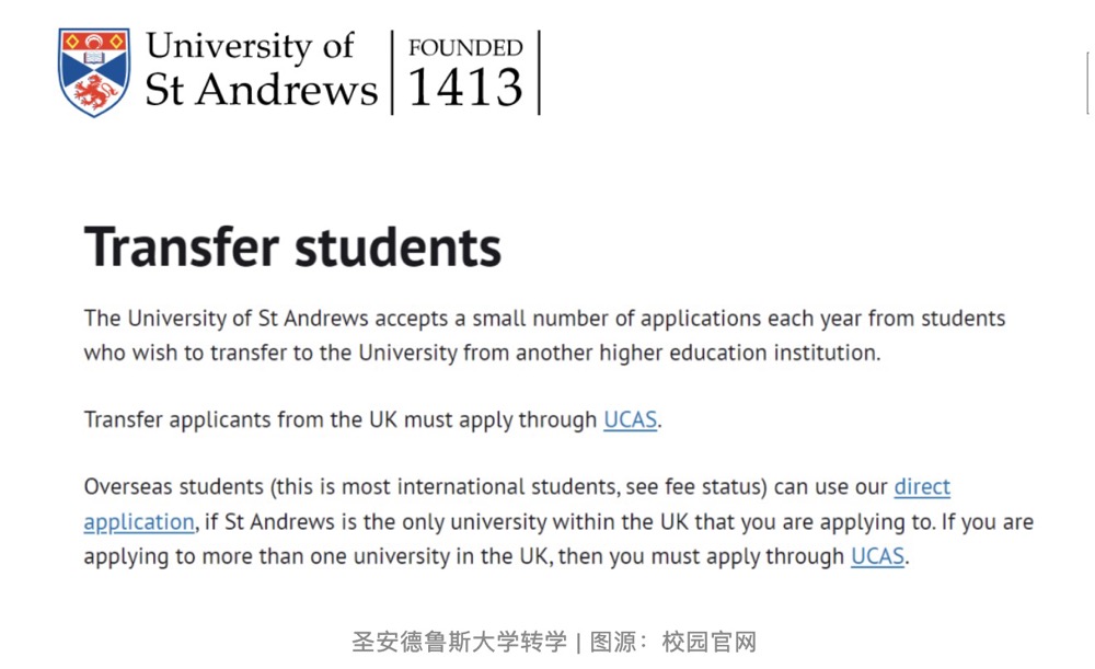 这也与学生自身“原本的大学”有关,以圣安德鲁斯大学为例, 英国 的转校申请人需要 直接从UCAS申请 。 而 海外学生 如果仅仅把圣安当作 唯一 的转校目标,则可以 通过学校直接申请 !而有 多个目标院校 则仍需要 通过UCAS申请 !