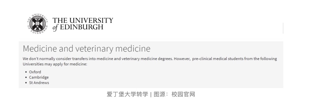 而爱丁堡大学也对医学、兽医课程的转校生有着严格的限制,仅考虑接受 牛津大学、剑桥大学及圣安德鲁斯大学 的相关专业学生。