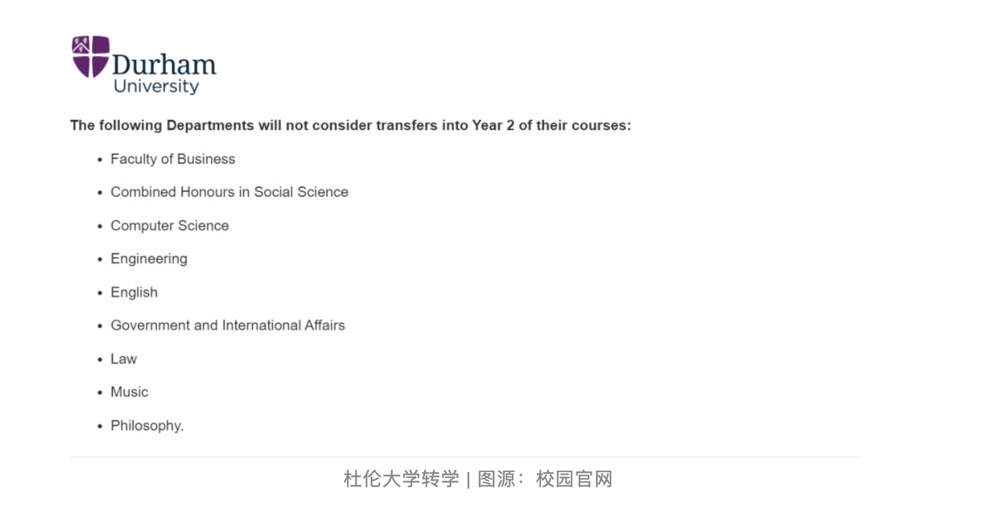 与此同时, 并非所有课程都接受 【 直升大二 】 ,以杜伦大学为例,商学院、社科类综合课程、计算机科学、工程学、英语、政府与国际事务、法律、音乐、哲学专业不接受转入大二。