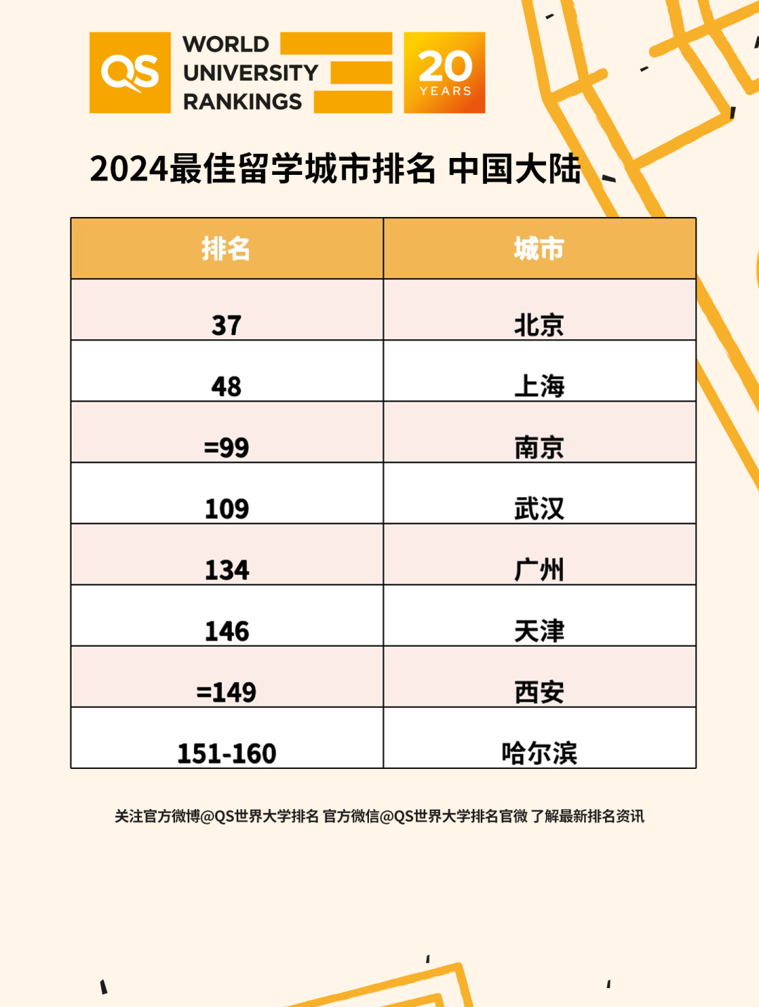 以下是中国(大陆)上榜城市,本次共有8个城市进入榜单, 北京、上海和南京进入2024QS最佳留学城排名全球前一百 ,而天津和哈尔滨首次进入榜单。