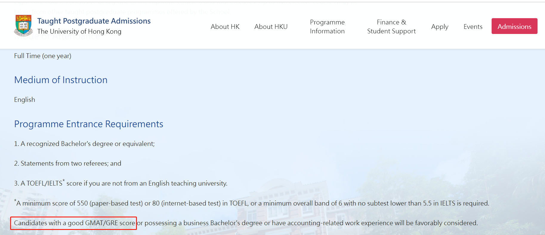 香港商科申请非常激烈,尤其是想要申请港前三商学院的同学,强烈建议努力备考一个G类成绩,争取投递时带 GMAT 700+ 或 GRE 320+ 申请。
