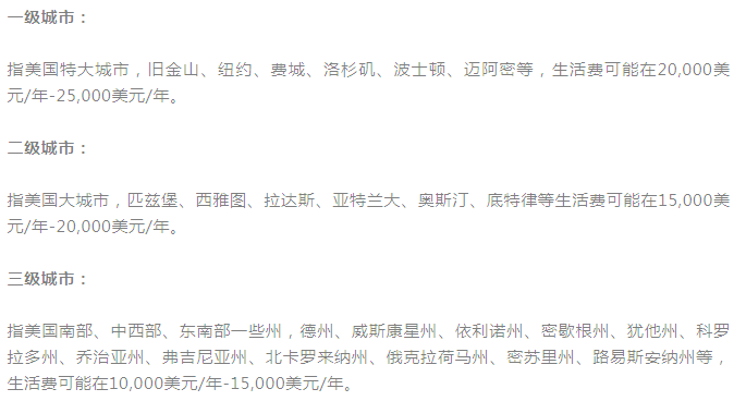 除了上述提到的费用,美国各州留学生活费所需金额也有着较大差异,根据每个地区消费水平的不同,城市规模的大小,美国生活费大致分为三个等级: