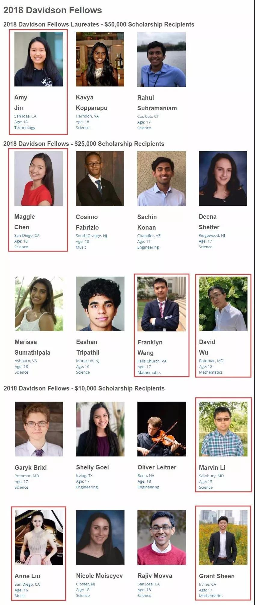 业余爱好方面,这些年轻人也都是个中佼佼者:Amy Jin喜欢计算机,并获得过多项美国计算机竞赛奖项,她还擅长拉小提琴,是加州青年交响乐团成员,还曾以独奏者的身份在卡内基音乐厅演出;Maggie Chen擅长单簧管和钢琴,14岁时就在卡内基音乐厅独奏表演了;醉心于数学问题的Franklyn Wang多次参加美国奥赛,并在数学、物理、计算机等学科都拿过奖;Davi Wu从小就参加各种天才少年项目,除了对数学痴迷外,他还在苦练滑冰;Marvin Li喜欢数学、计算机、物理、击剑和钢琴,拿过美国计算机奥林匹克竞赛银奖,还创办了一家为高中生提供金融教育的公司,中学时期就写过他所在地区癌症复发统计分析的论文,而且,现在才15岁的他,几年前就已经是戴维森青年学者了;喜欢音乐的Anne Liu将自己的才艺发挥到淋漓尽致,参加过各种音乐节和国际音乐竞赛,拿过很多奖,也因此去了世界很多国家并爱上了旅行;Grant Sheen兴趣广泛,参加过很多科学竞赛,同时还是美国B级击剑运动员。