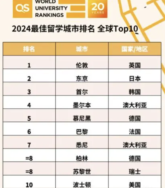 在本次最佳留学城市排名TOP10中,伦敦位居榜首,伦敦连续第五年蝉联桂冠! 东京排名提升5位,位列全球第2,首尔位列全球第3。墨尔本在本次排名中上升了1位,位列全球第4。