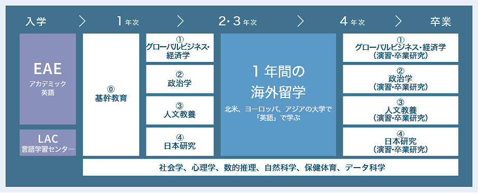 大二开始分专业方向:国际商务与经济学、政治学、人文教养艺术、日本研究 入境·入学时间: