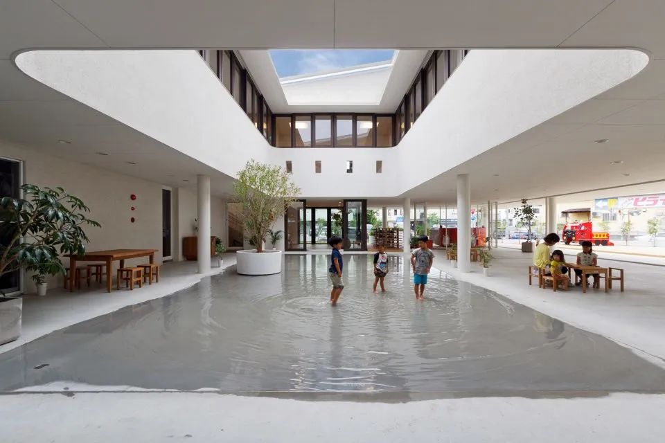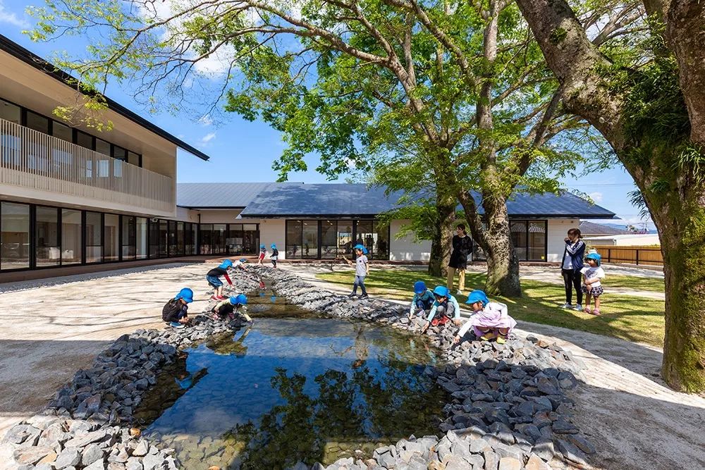 而日比野拓的主张是: 幼儿园要置于大自然,“有一点危险”也很好。 所以我们在他的设计作品中 宫崎县的MRN幼儿园,有着大池塘。