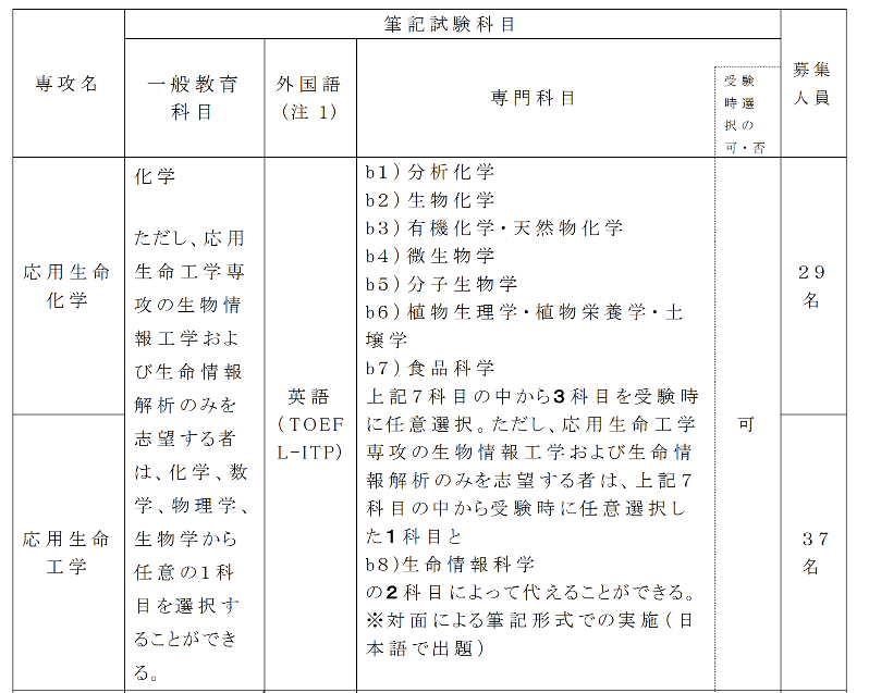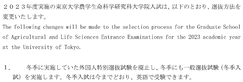 从2023年度开始,农学生命科学研究科 废除了外国人特别选拔考试 ,所有留学生必须参加夏季或冬季的一般入试。