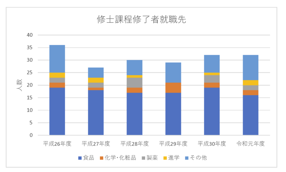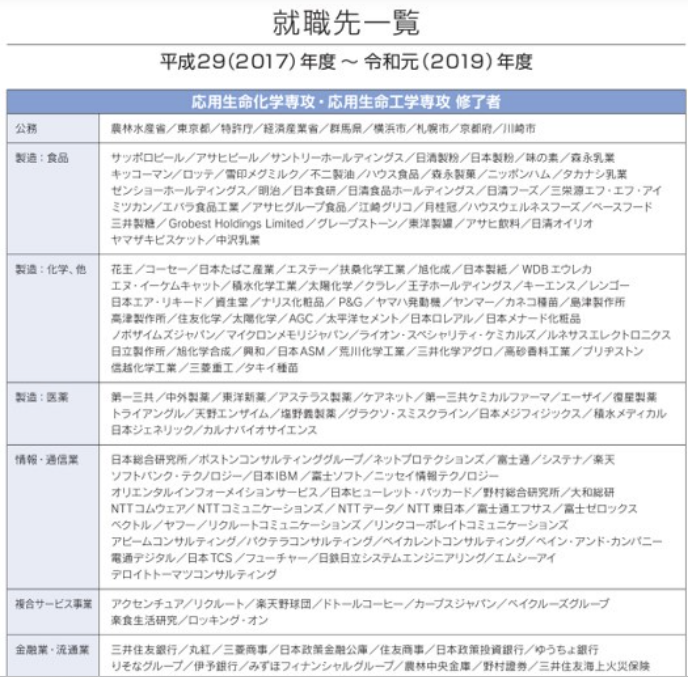 在就职方面,大多数毕业生在 食品、化妆品、制药公司 就职,其中不乏朝日、格力高、日清、资生堂、小林制药等耳熟能详的大手企业。