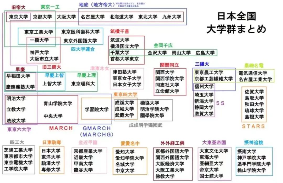 值得注意的是:7所旧帝国大学+一桥大学+东京工业大学+神户大学也常被合称为“旧帝一工神”,代表了日本国立大学的最高水准。