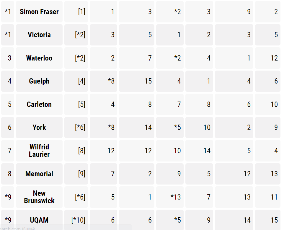 并列第一的两个大学分别是西蒙菲莎大学和维多利亚大学,滑铁卢大学排在第三位 。