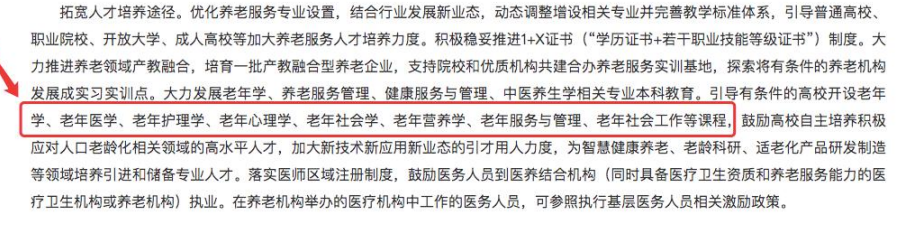 随着我国人口老龄化的加速,老年人们的健康、安全和福利已经成为未来养老政策中的关注点。在这种情况下,养老产业对于高素质的专业人才需求量不断增加。我国已经有政策出台关注教育中老龄专业人才培养的设置计划。