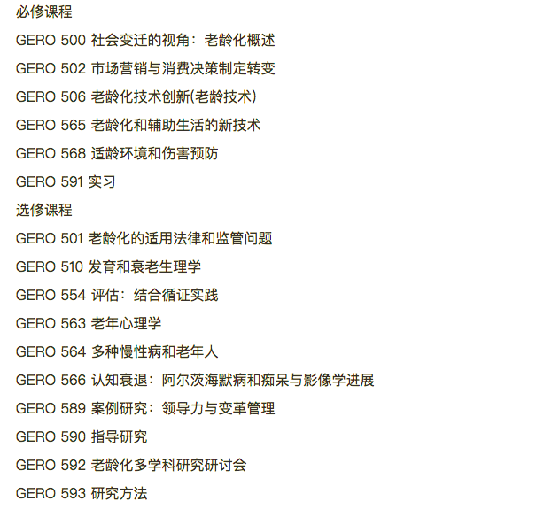 例如美国南加州大学开设的应用科技与老龄化硕士课程,该课程包含24个必修课和8个选修课程。