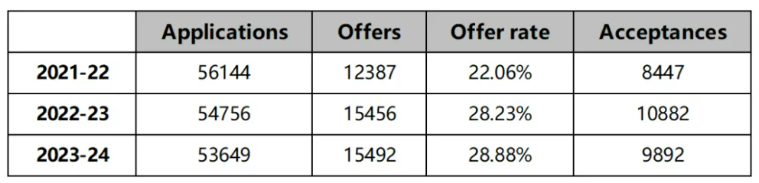 可见,23Fall中国的申请一共有53,649份,发放的offer有15,492份,录取率约为28.88%。