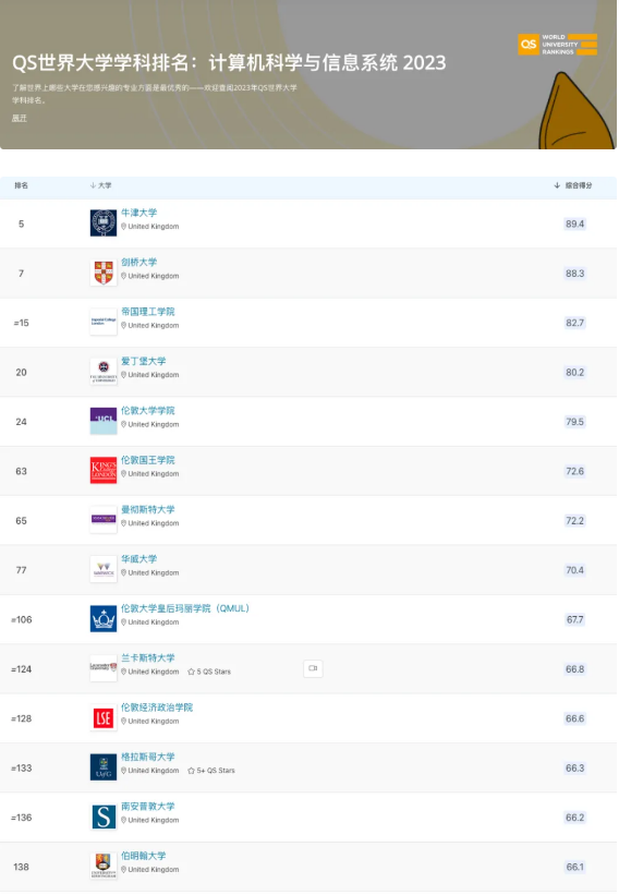 在QS计算机科学与信息系统专业排名中,英国院校榜单如下: