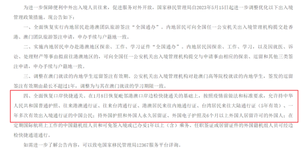 国家移民管理局发布的“关于进一步调整若干出入境管理政策措施的公告”当中提到,