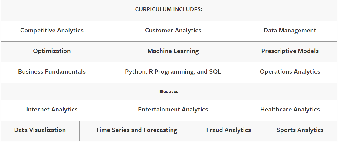 从课程来看, 统计 相关的课程占较大部分,例如statistics, optimization, time series等; 编程 一般有1-2门课,还是在其他课程里体现的,例如practicum;而且,在商业分析专业中,没有一门课程完全是“商科”的,多多少少都会要求微观经济等课作为基础。