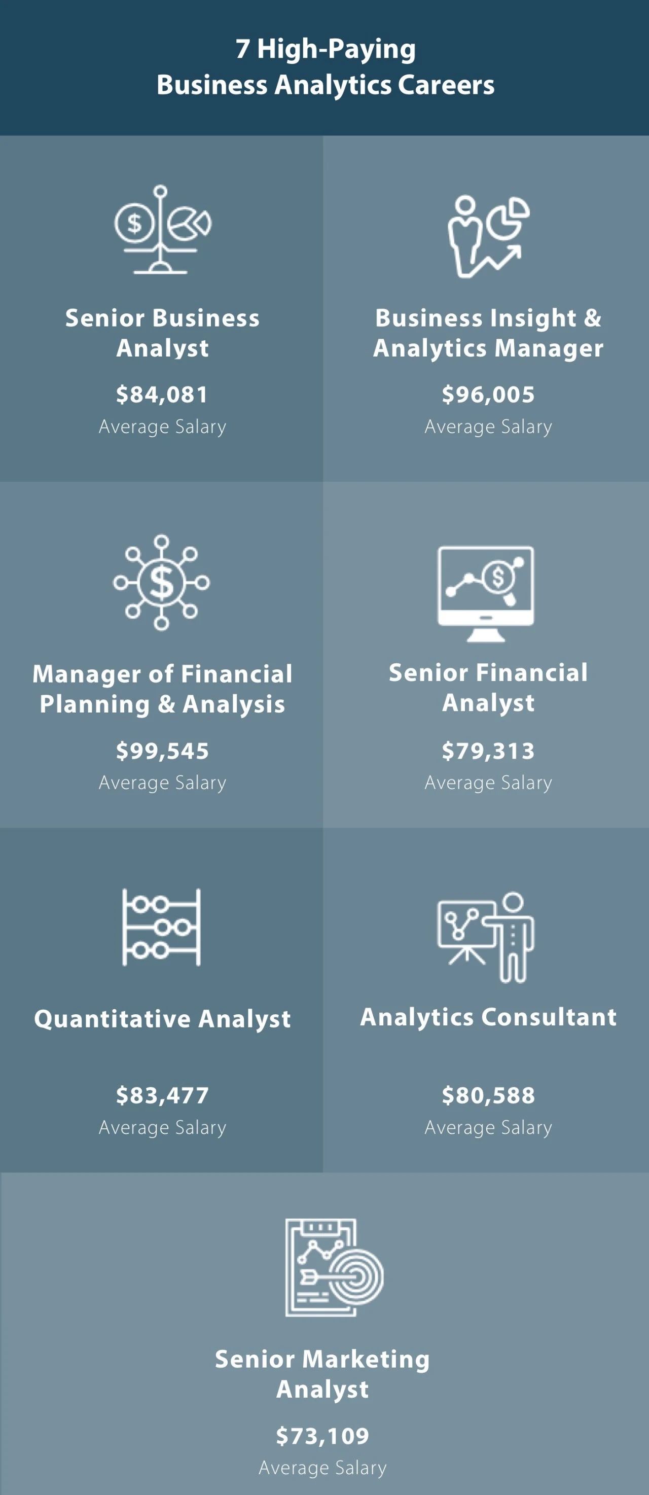 根据Payscale数据,拥有商业分析硕士学位的人平均工资为 72,000美元 ,当然做到高级职位平均工资能达到10万美元。