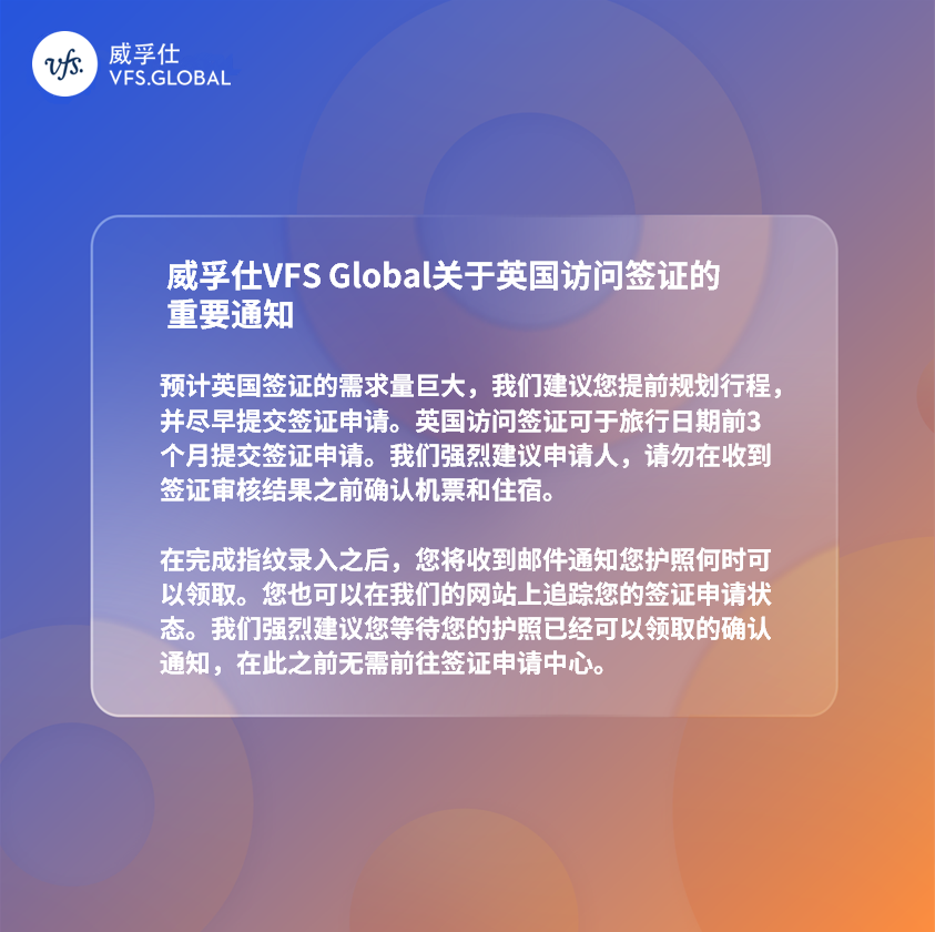 英国访问签证可于旅行日期前3个月提交签证申请。我们强烈建议申请人,请勿在收到签证审核结果之前确认机票和住宿 。 在完成指纹录入之后,您将收到邮件通知您护照何时可以领取。您也可以在我们的网站上追踪您的签证申请状态。我们强烈建议您等待您的护照已经可以领取的确认通知,在此之前无需前往签证申请中心。 感谢您的理解。