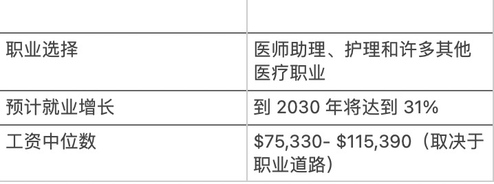 护士和医师助理是最受欢迎的两个医疗职业。随着大部分人口老龄化,他们将寻求医疗服务来解决与年龄相关的健康问题并提高生活质量。医院将寻找护士和医师助理来填补传统医生的许多角色。 Association of American Medical Colleges预计,未来几年合格的医疗服务提供者将会短缺。这一发现只会增加学生从生物学专业开始本科职业生涯并在护理或医师助理学校继续研究生工作的需求。