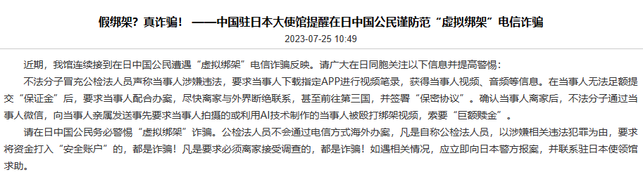 近日中国驻日本大使馆发布了公告,提醒在日留学生及其国内家人一定要警惕“虚拟绑架”的新型诈骗手段。