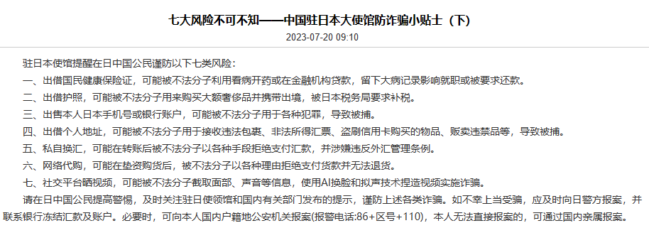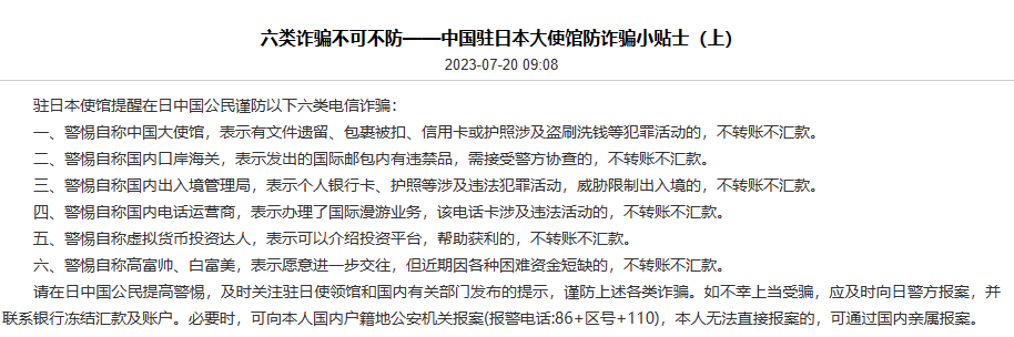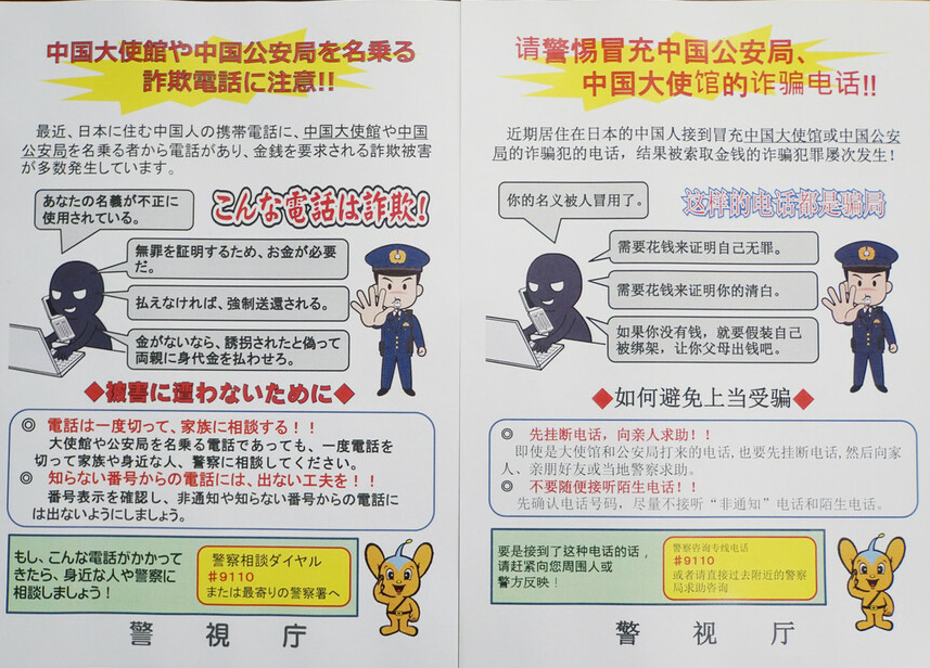 中国大使馆呼吁「自报说是公安职员,要求汇款的都是欺诈」。警视厅也向日语学校和大学分发了中文传单,让留学生对诈骗电话重视防范起来。