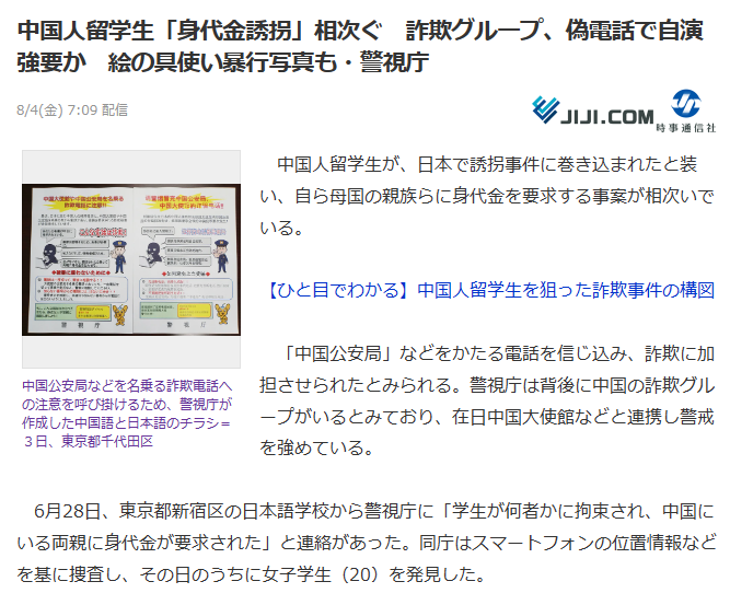 一些中国留学生在日本伪装成被绑架,向在中国的亲属索要赎金,这些案件层出不穷。