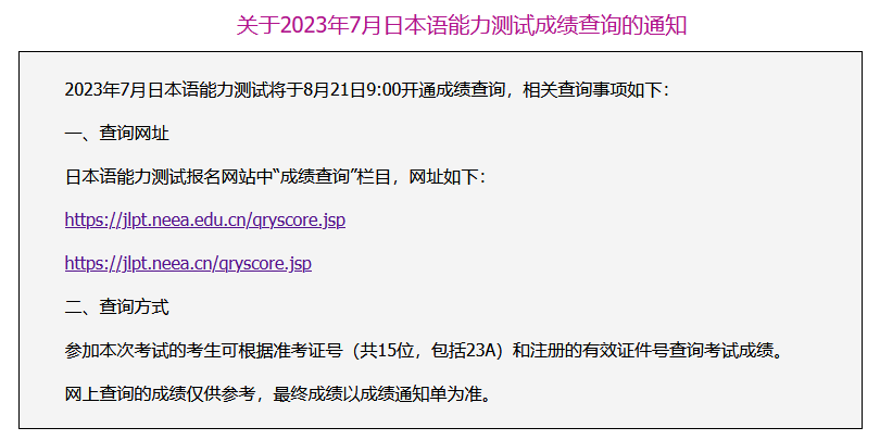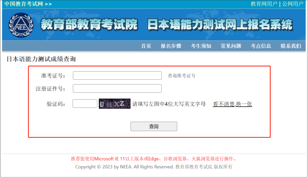 同学们可 根据准考证号和注册的有效证件号查询考试成绩。 打开中国教育网,进入日本语能力测试网上报名系统,输入 准考证号、注册证件号、验证码, 查询7月考试成绩。 忘记准考证号的同学可以点击”查询准考证号“找回。