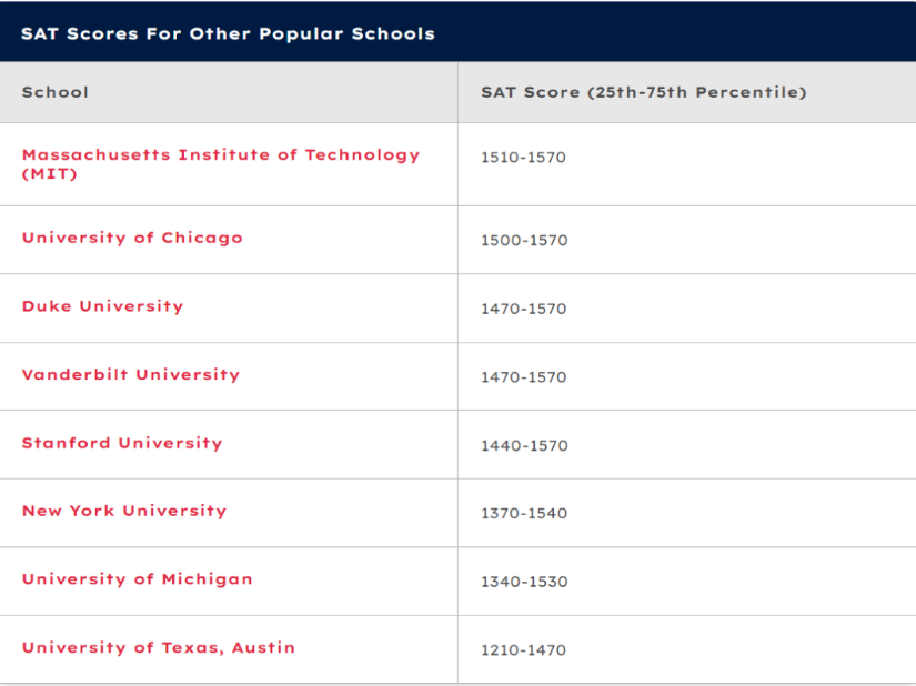 麻省理工学院、芝加哥大学、杜克大学、范德堡大学、斯坦福大学这几所顶尖热门学校录取学生提交的SAT成绩也居高不下。