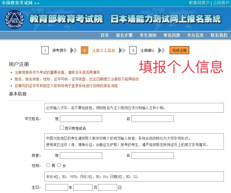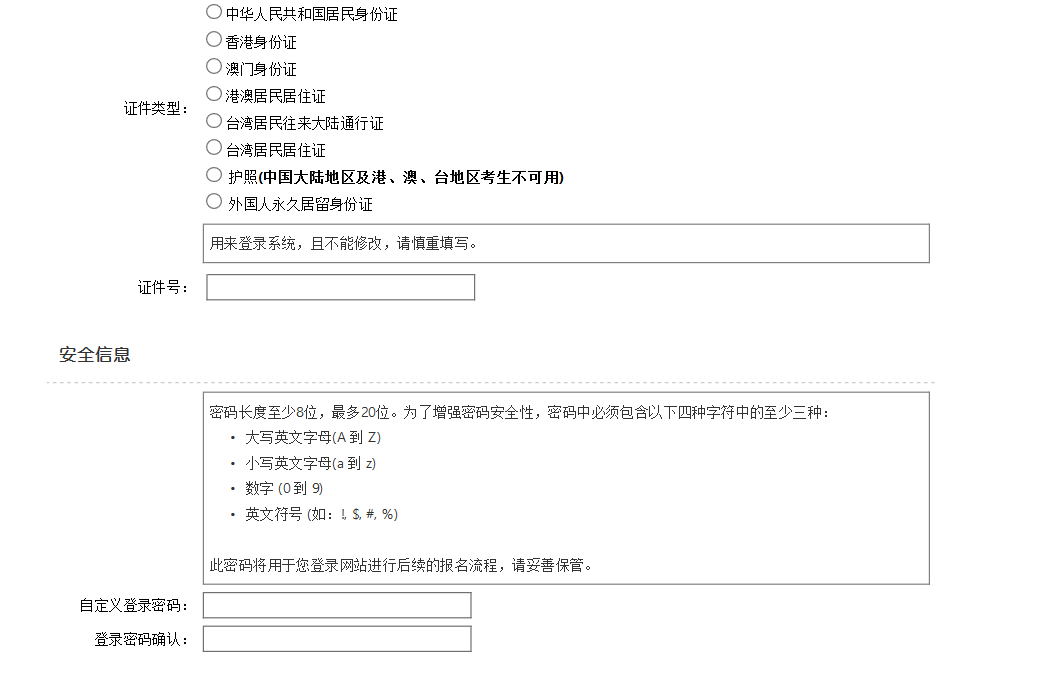 注意: ①验证码需要 大写 ; ②注册信息事后有可能 不能修改 ,请千万谨慎填写,不能出错! ③使用护照报名的考生,请严格按照护照上的英文姓名填写。