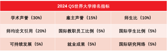 根据QS官方表示,本年度的榜单对排名方法进行了有史以来最大化改善,全新引入三大指标——“可持续发展”、“就业成果”与“国际研究网络”,成为全球唯一一个同时包含这些指标的排名,及时地反映了当今社会的热点课题以及学生群体所关心的核心问题。